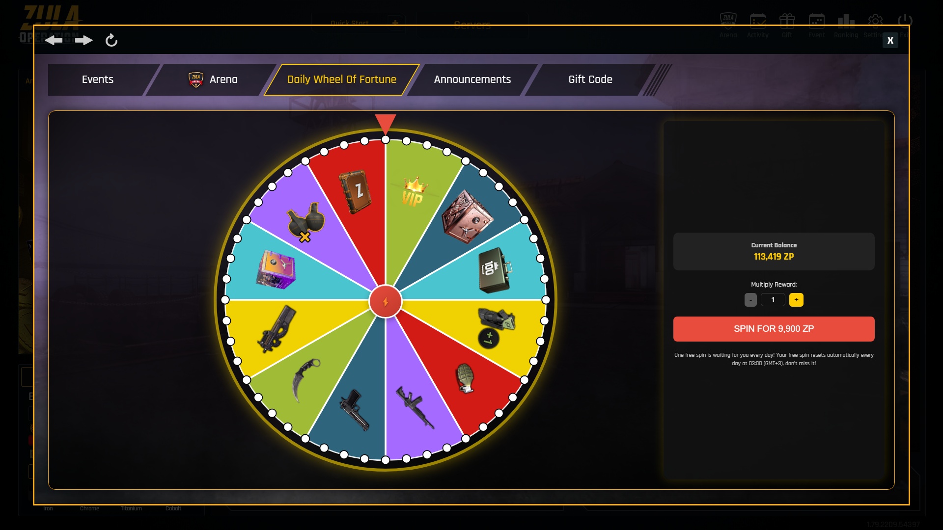 In Zula, you can now spin the Wheel to win legendary rewards. You get one free spin every day, and after that, you can continue spinning using ZP collected in game.